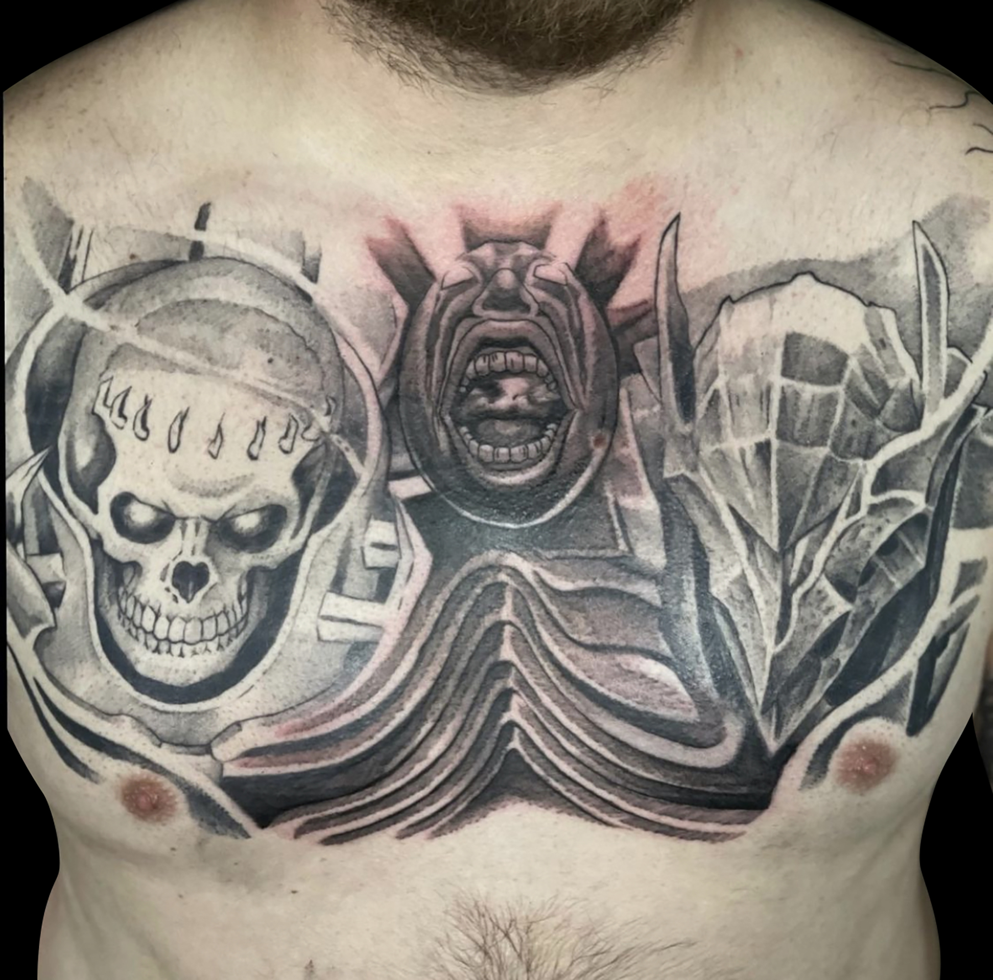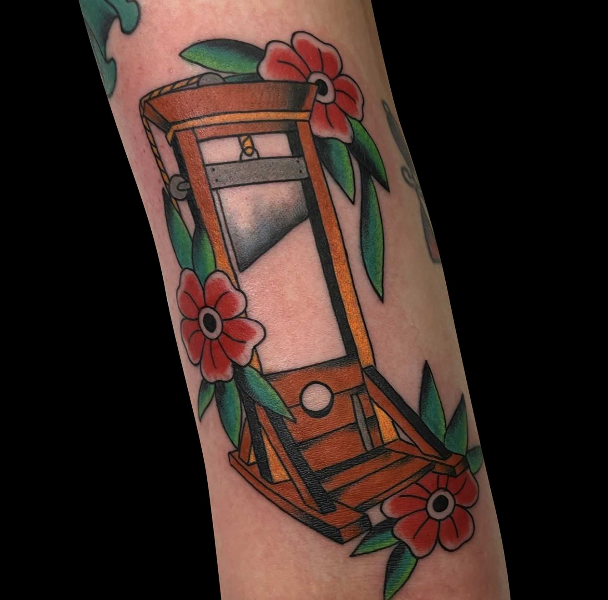 Dan did a pretty rad guillotine tattoo this week. Mike finished a chest piece on one of our counter staff. Those and more below.