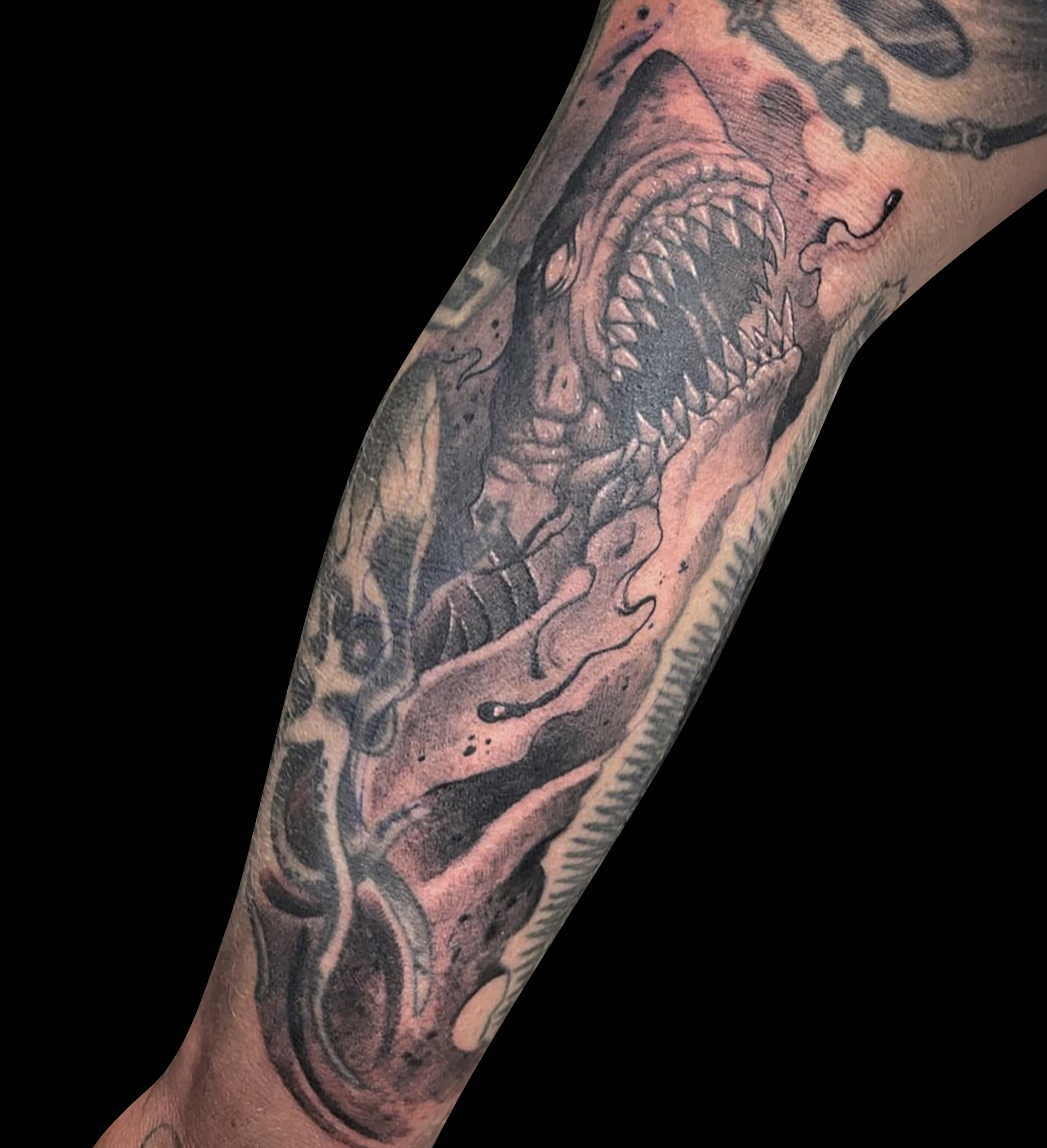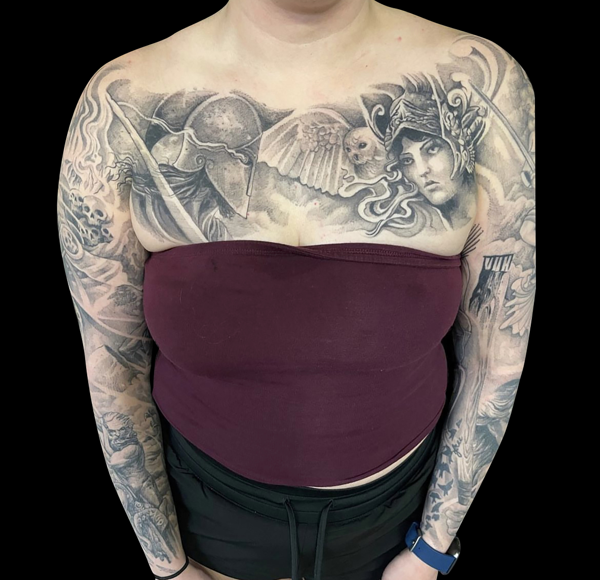 This week Dan got to work on an American traditional dragon head. Mike made more progress on an ongoing black and grey Greek God sleeve and chest piece set. Those and more below.