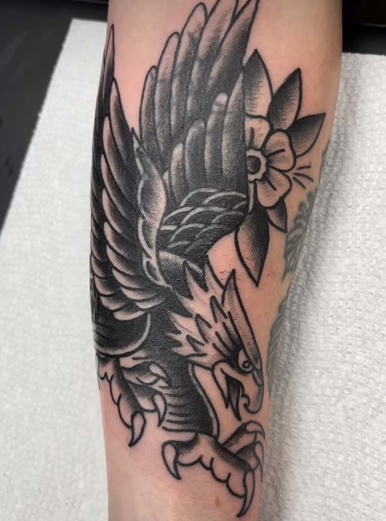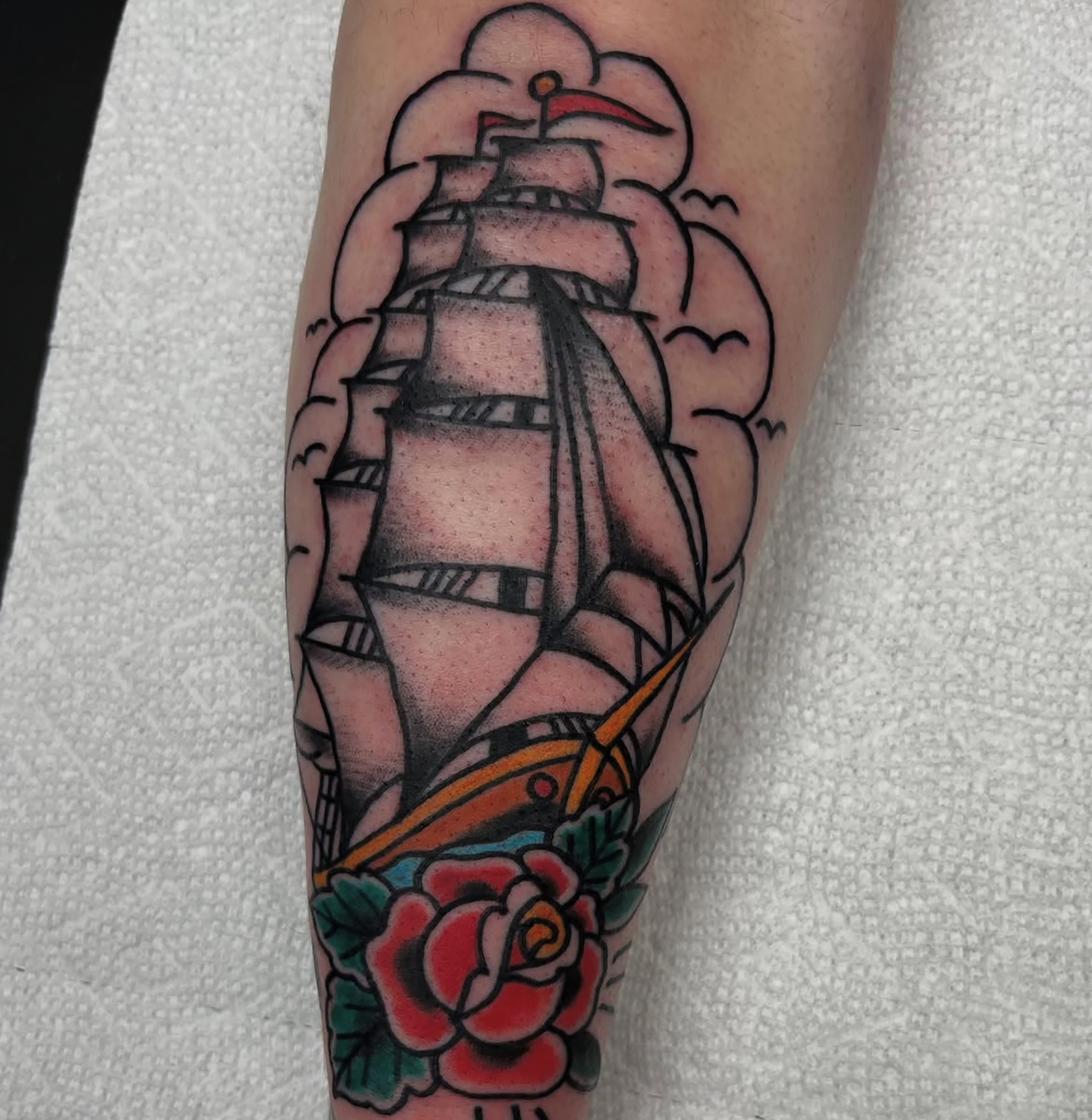 Dan did this traditional clipper ship recently. He and the rest of the crew are available for walk-in’s and appointments Tuesday-Saturday. Come through and lets put a cool one on you!