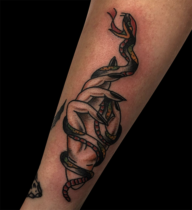This week Mike did a black and grey tiger portrait and Dan did a traditional hand and snake. Check it out.