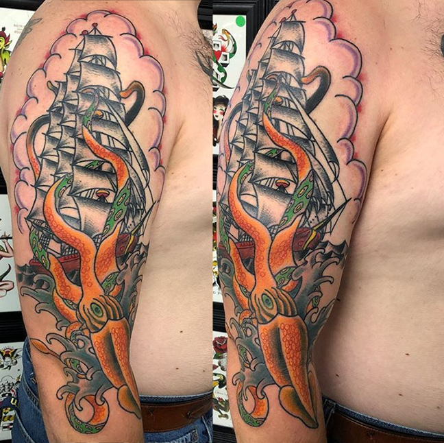 This week Dan finished a traditional squid and ship half sleeve, Mike did a sick Edward Scissorhands glove, and Felix tattooed lavender down here client’s spine. Those and more below.