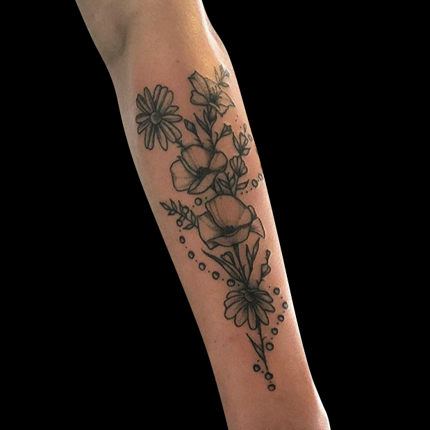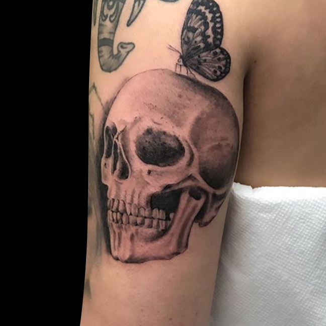 This week Mike did a black and grey floral skull, Dan got to tattoo a through and through dagger on his friend’s shoulders, and Felix tattooed a skull with a butterfly on a client’s arm.