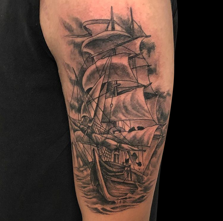 This week Dan did a black and grey sparrow on one of his regulars and Mike did a big clipper ship. Also got a pic of a cool one Felix did awhile back.
