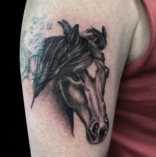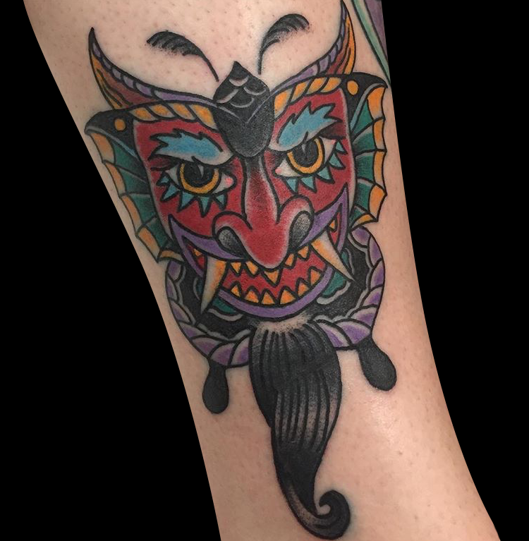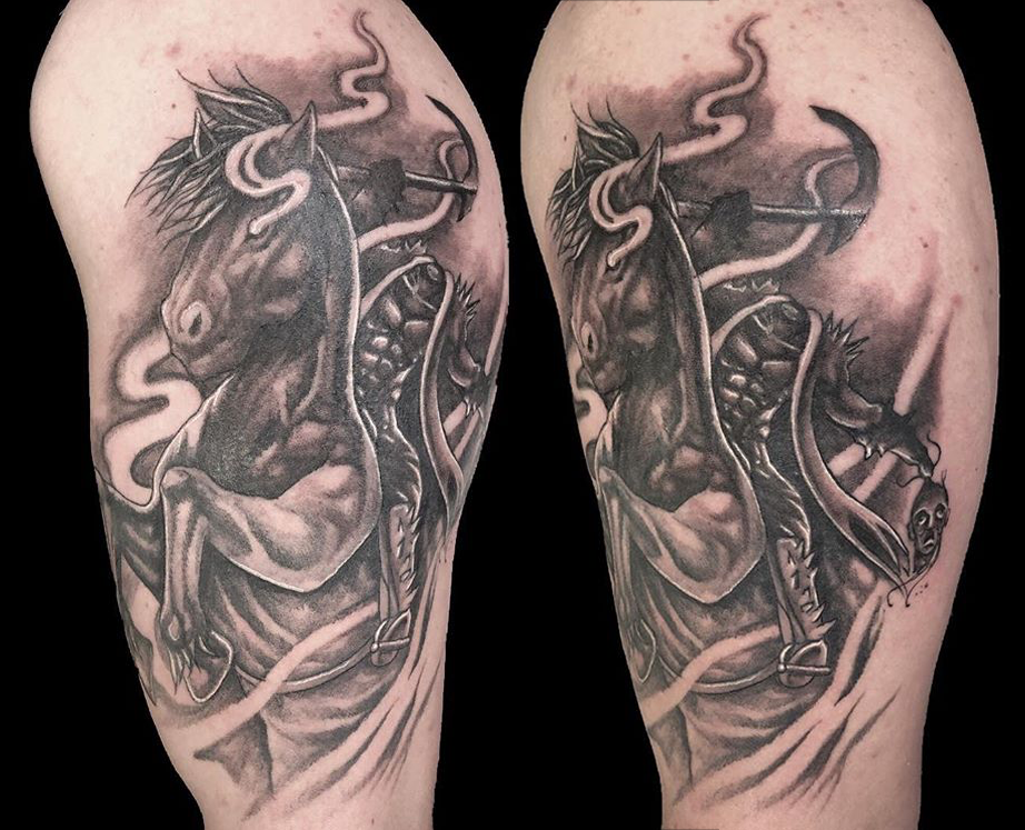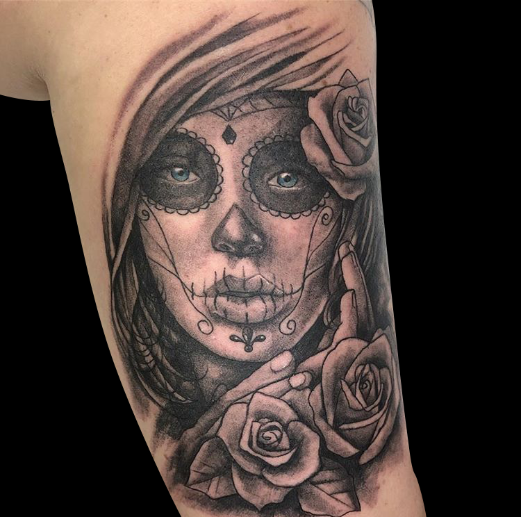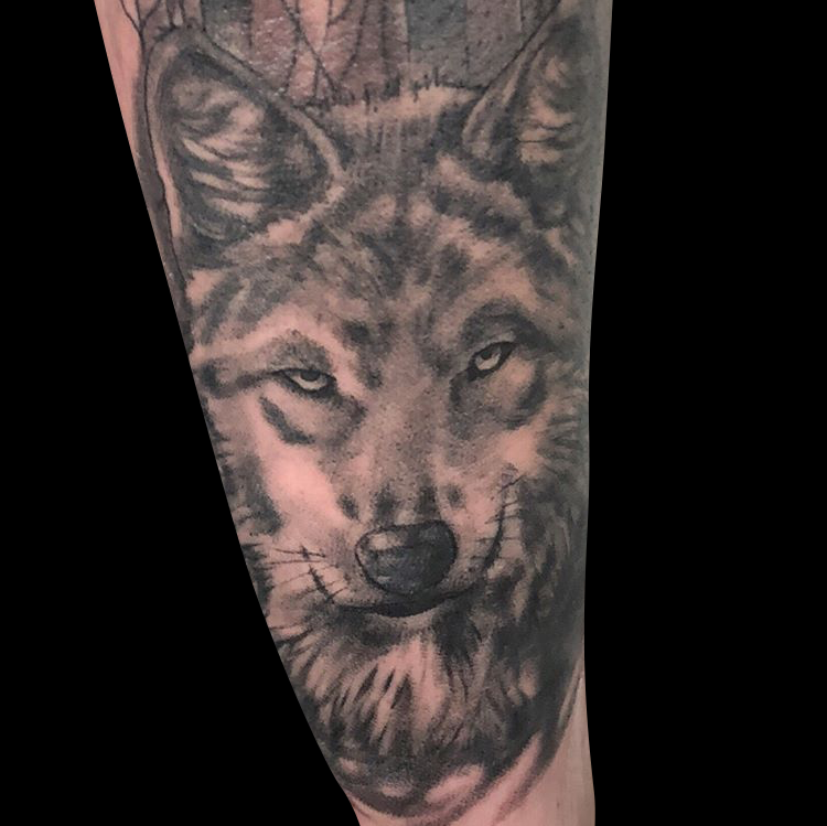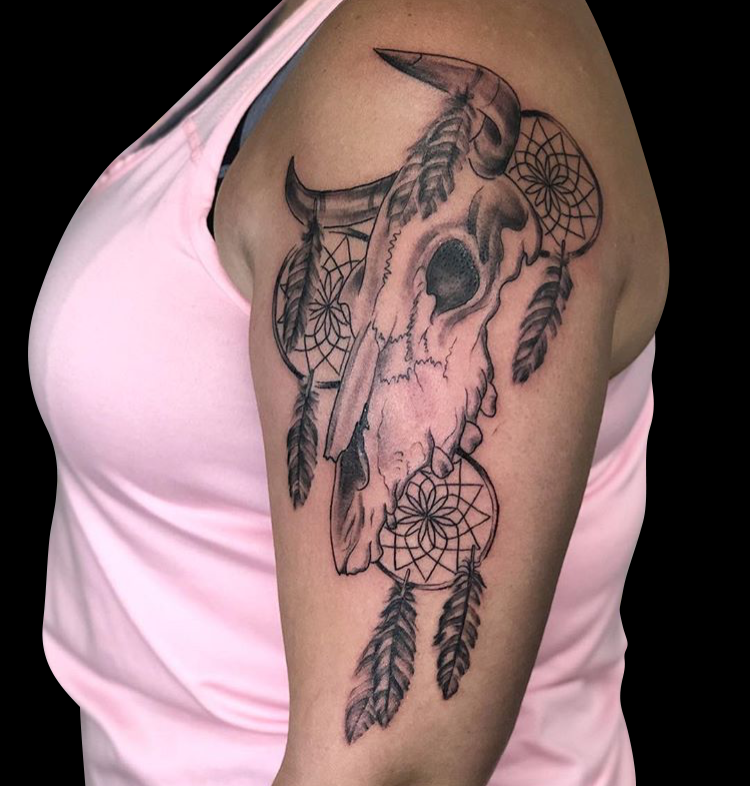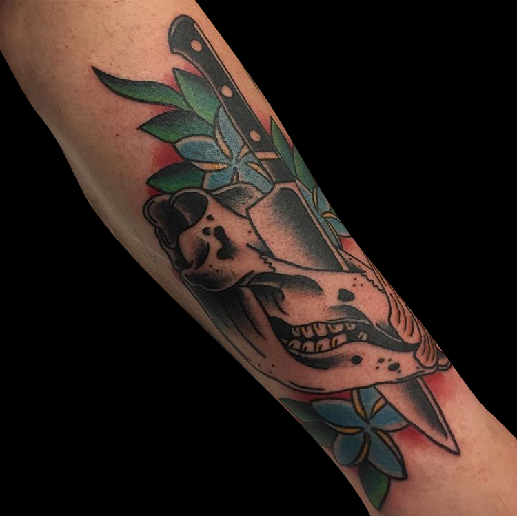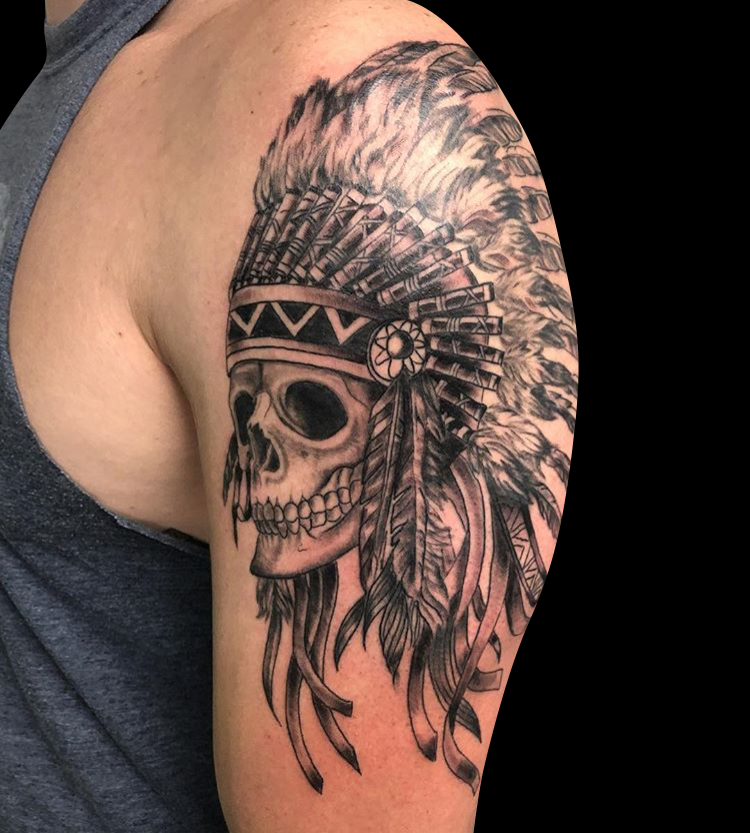 This week Felix worked on a skull with a native head dress, Dan did a traditional butcher tattoo and Mike wrapped up a black and grey wolf. Those and more below.