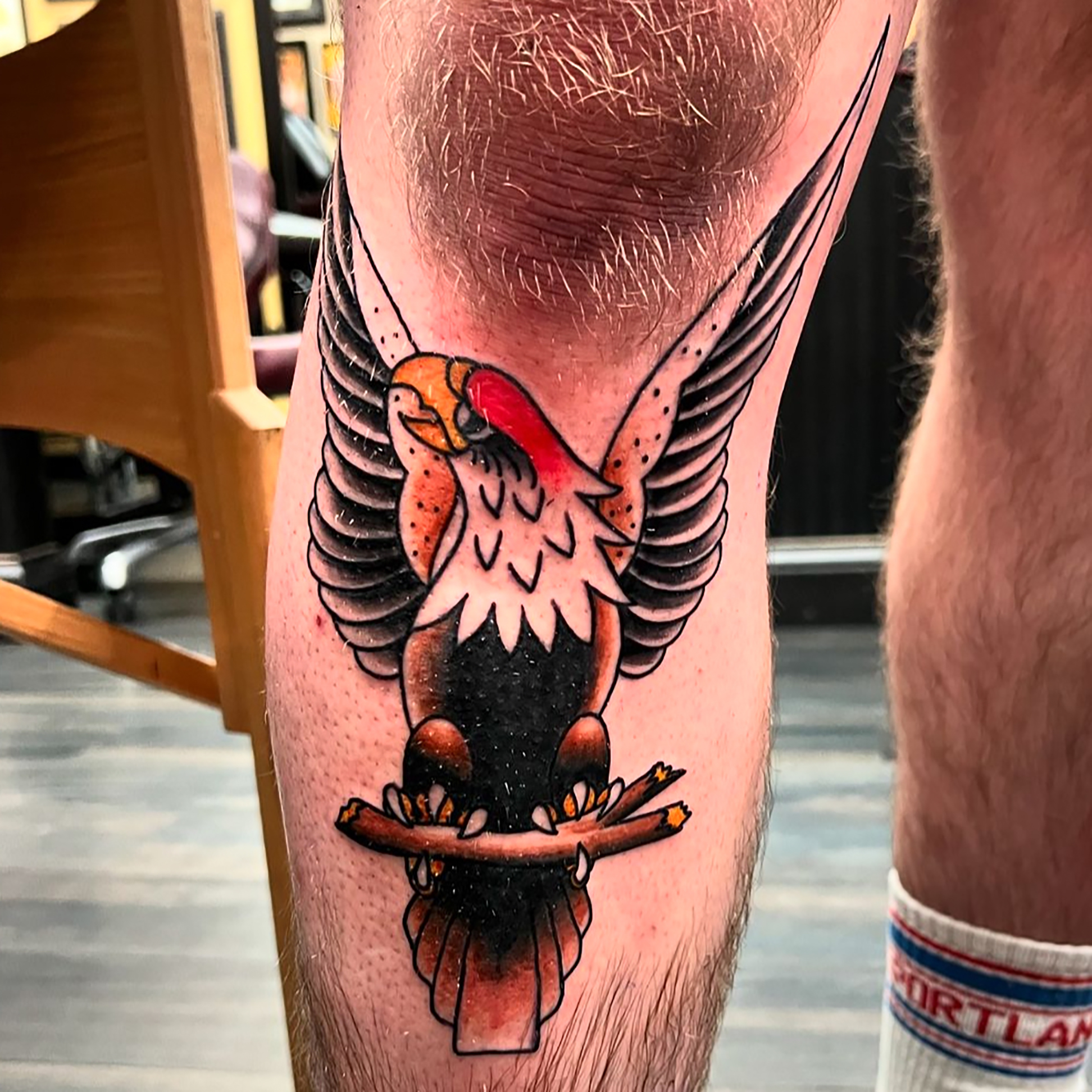 Here’s a new wild boar tat by Dan and an older eagle by Cam. Stop by anytime.