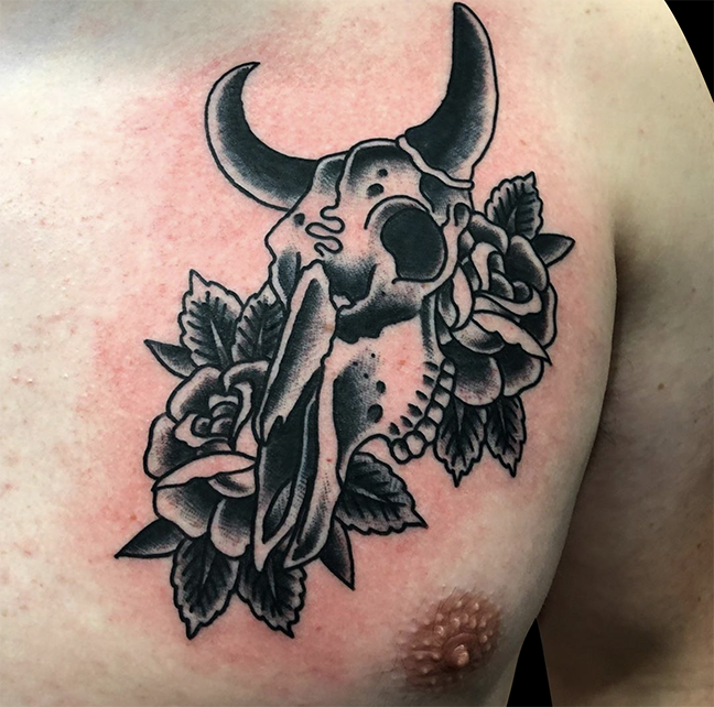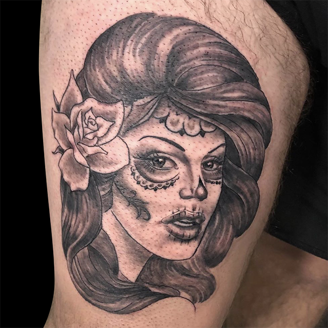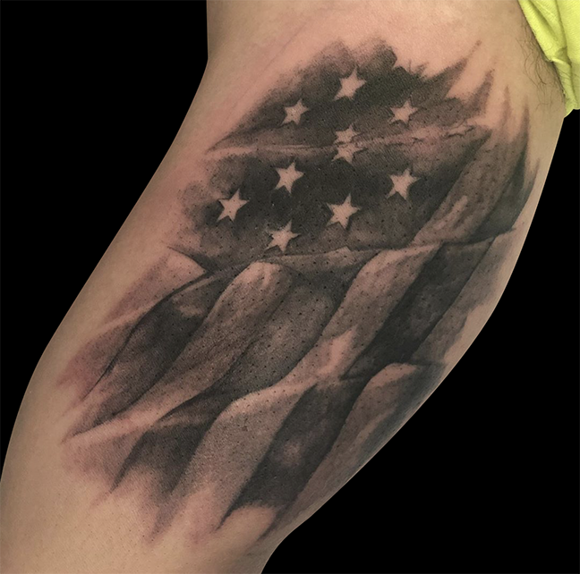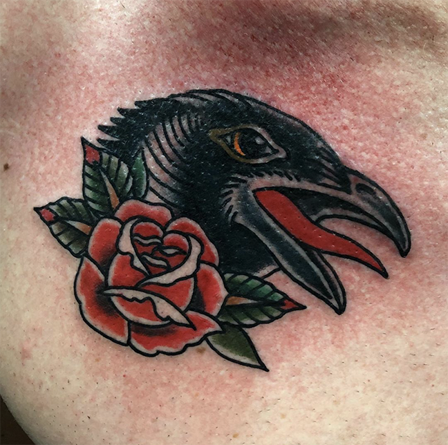 This week Felix got to do a sugar skull lady, Mike did a black and grey American flag and Dan put a crow on a dude’s chest.