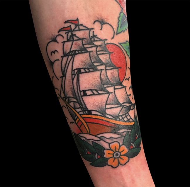 Mike did a really cool hour glass skull this week. Felix tattooed a little dog portrait on a client’s arm. Dan got to do a clipper ship. Take a look.