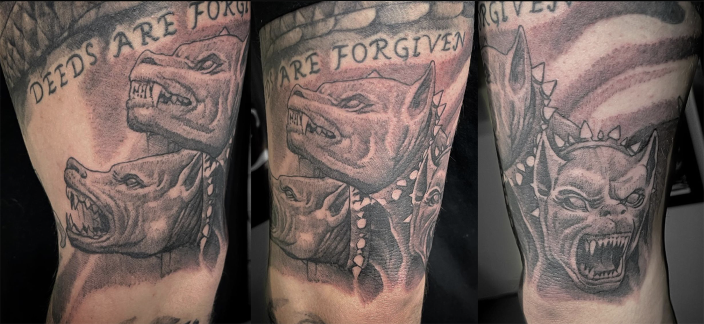 This week Mike did a Cerberus tattoo. Dan did a tiger head with a dagger on a clients leg. Those and more below.