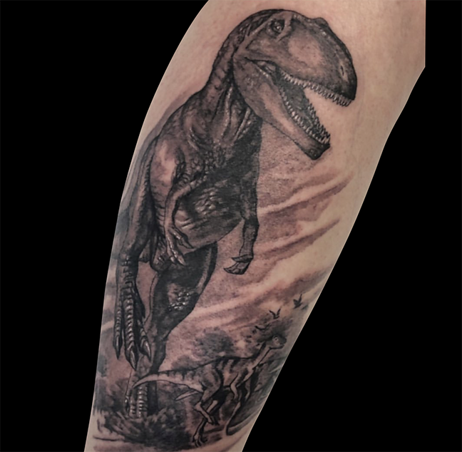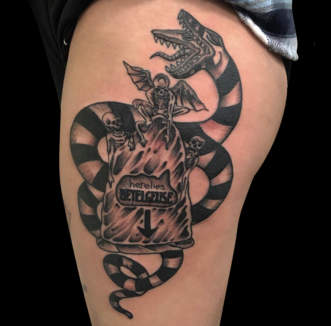Felix worked on a leopard gypsy girl half sleeve, Mike tattooed a T-Rex on a clients arm, and Dan did a Beetlejuice tattoo. Check ’em out.